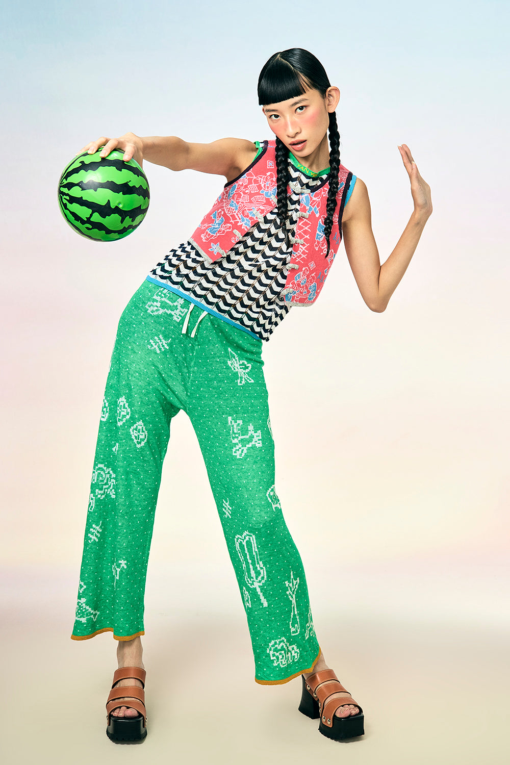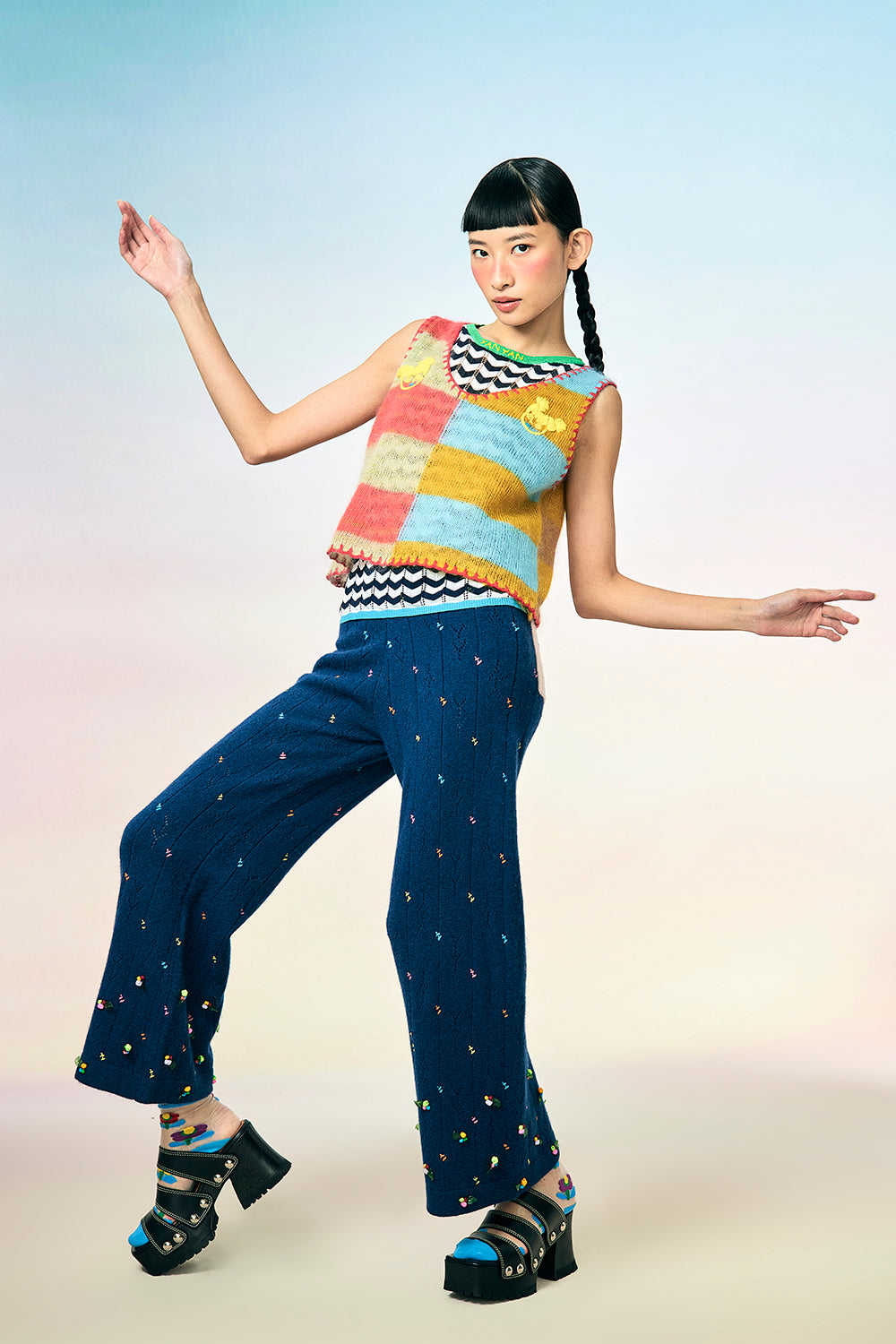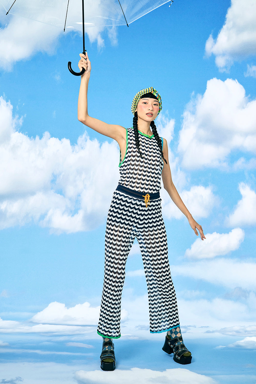 Lace inspired stitch in graphic chevron stripes with delicate pointelle details, knitted from fine cotton cord yarn. Hand embroidered "YANYAN" at neck. Contrast color at neck, armholes and hem. Slim fit with high neck. Fabric has stretch.